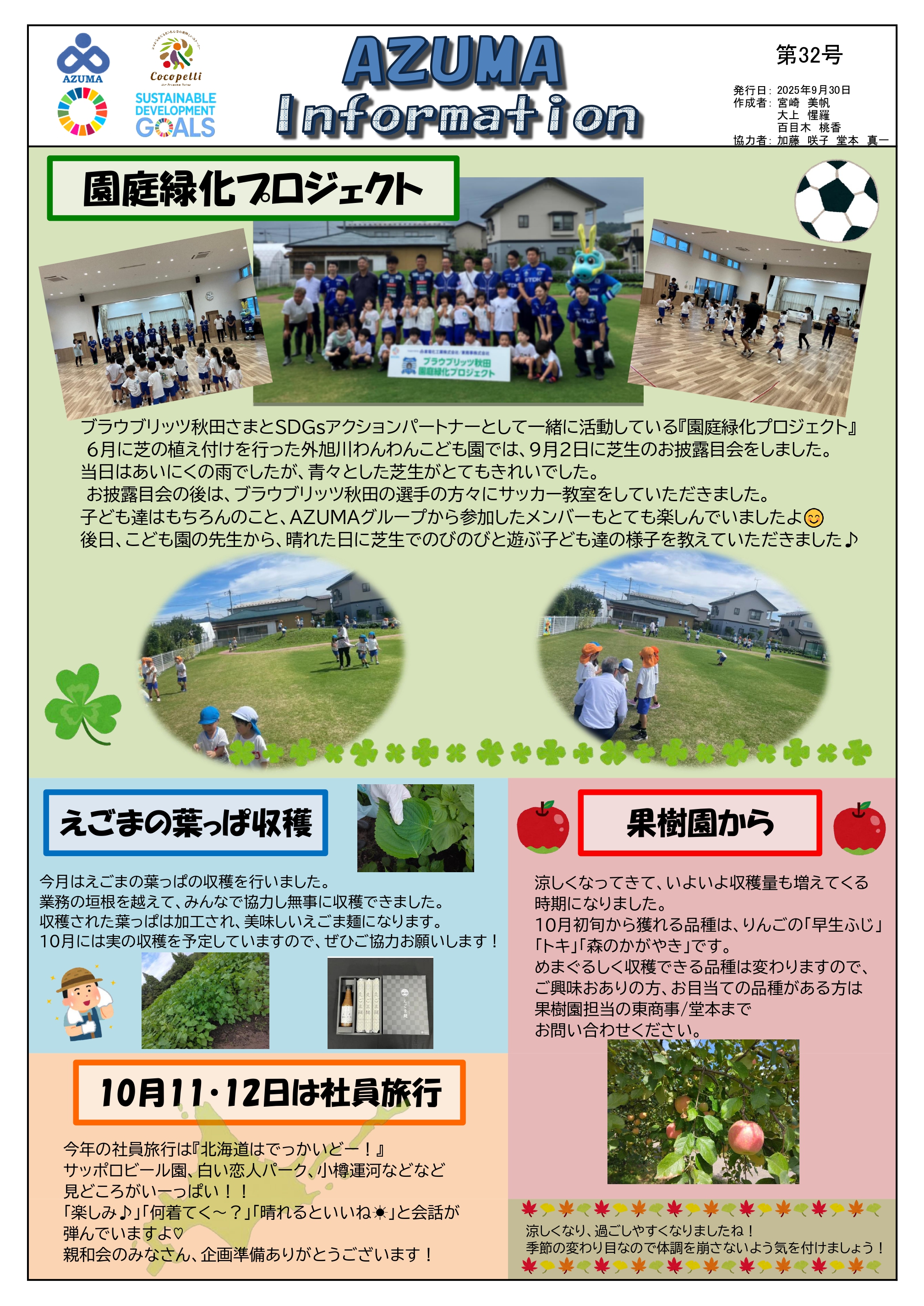 AZUMAグループでは「AZUMA Information」という社内広報を月に一度、発行しています。 第32号となる今回は、園庭緑化プロジェクトの現在について、果樹園の様子、えごまの葉摘みの実施について掲載しております♪ 是非ご覧ください!