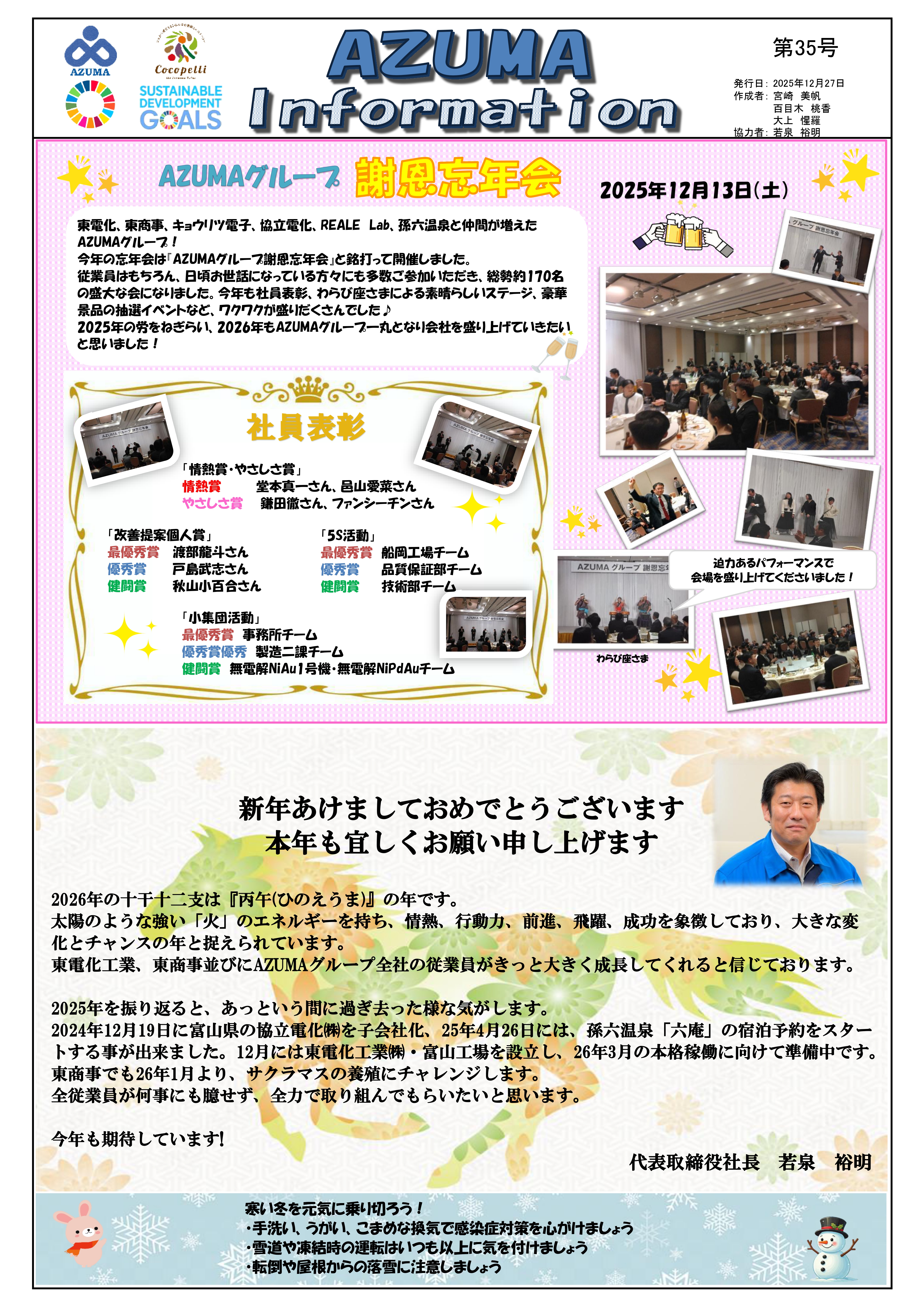 AZUMAグループでは「AZUMA Information」という社内広報を月に一度、発行しています。 第35号となる今回は、12月13日に行われたAZUMA グループ謝恩忘年会についてです。